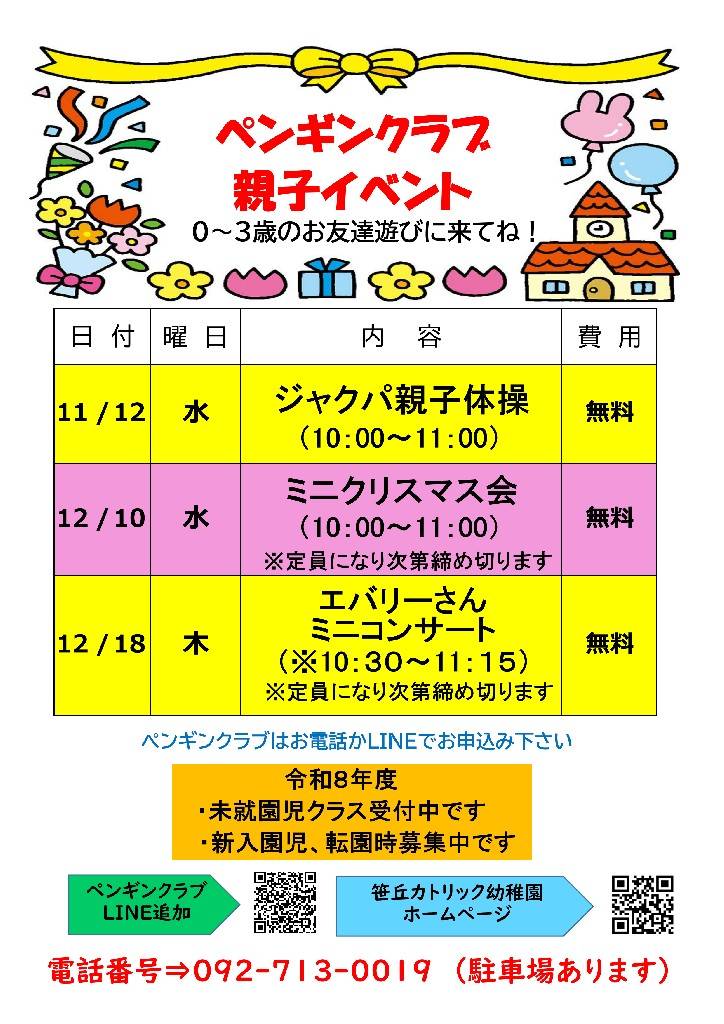 HOME > お知らせ一覧 > 園からのお知らせ > 11~12月親子イベントの日程をお知らせします11~12月親子イベントの日程をお知らせします2025年10月31日2025年10月31日園からのお知らせ 11~12月親子イベントの日程をお知らせします。今回は親子体操やミニクリスマス会、ミニコンサートなど楽しいイベントがたくさんありますお気軽に遊びに来てくださいね♪ 令和8年度未就園児クラス、新入園の幼稚園の見学も随時受け付けております。ご検討されている方は、お気軽にお問合せ下さい ご予約は電話かLINEでお願いします ⇒ 092-713-0019